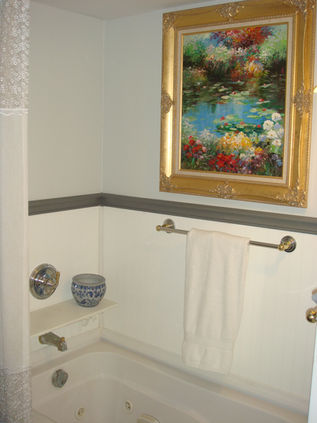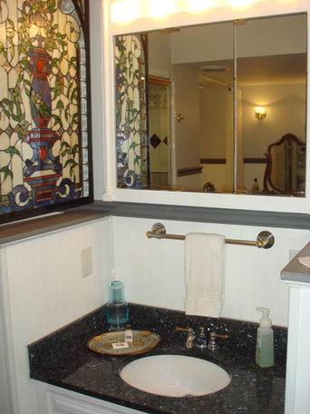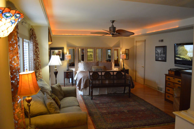 This suite is located on the ground floor in the Carriage House. The private entrance opens to an enormous area with a king size bed, floor to ceiling windows, a large flat panel TV, stained glass windows, seasonal fireplace and private sitting areas inside and out.